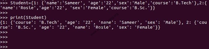 >>>Student= {1: {'name': 'Sameer', 'age': '22', 'sex': 'Male', 'course':'B.Tech'}, 2: {'name': 'Rosie', 'age': '22', 'sex': 'Female', 'course':'B.Sc.'}}